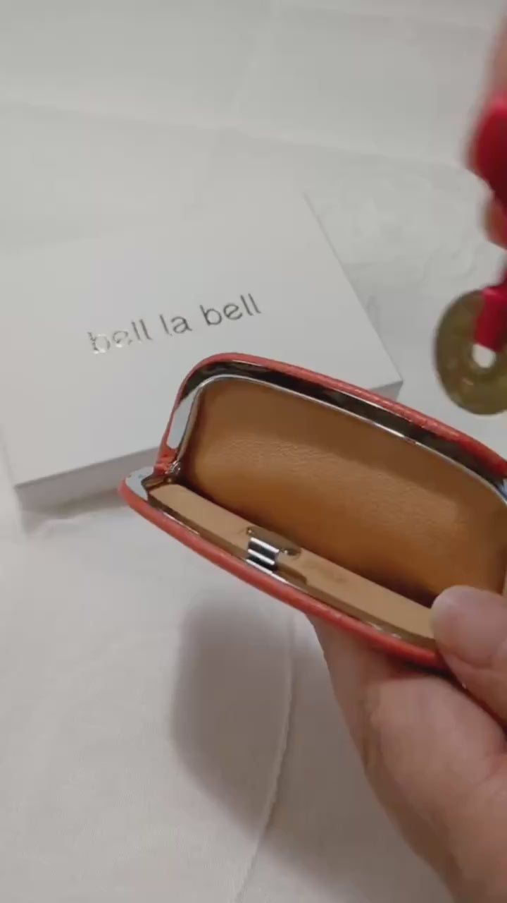 上質なシボのあるイタリアンレザーを使用したbell la bell ロゴ入りがま口小銭入れです。押し口タイプのため片手で簡単に開けられます。
